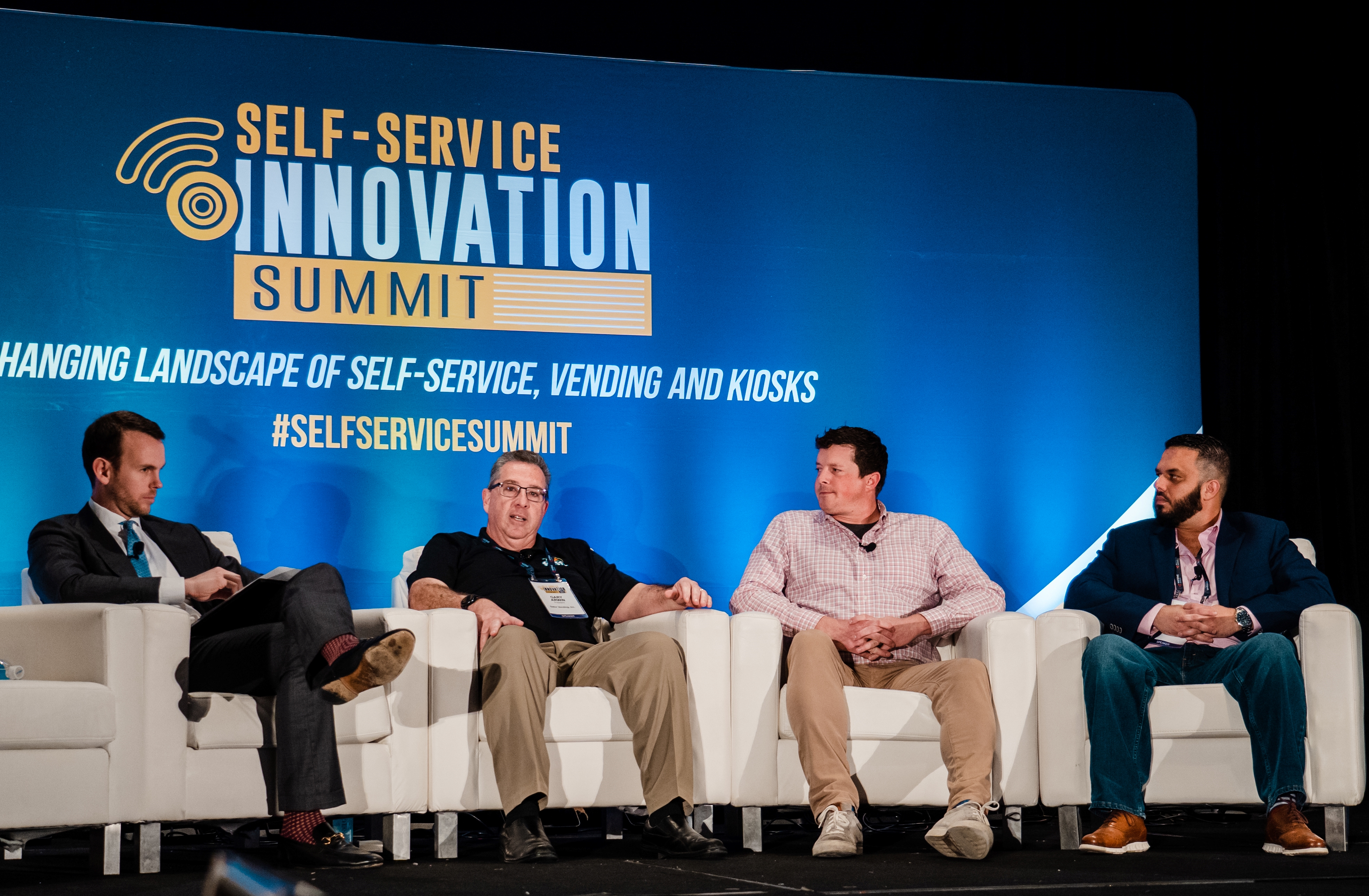 James Siggers of Invenda Group AG, left, introduces panelists Gary Arwin, Gator Vending; Michael Lovett, Capital Provisions and Albert Gonzalez, Best Office Coffee Service. |