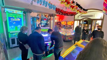 Andrea Tocci and Cesar Pampin of Sacoa welcome Remco Kriek of Fun City, center. Fun City, in Prague, Czech Republic, which boasts 45 cranes, arcade…
