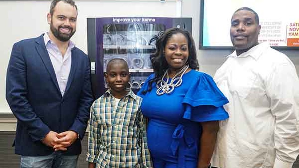 GOOD KARMA: (l. to r.) Karma Box founder A.J. MacQuarrie surprised Mikey with a free machine after seeing a news clip about his vending startup on a St. Louis TV station and contacting his mother and father, Arriel and James Biggs. MacQuarrie is working with the fifth grader to place the machine. He also helped the young entrepreneur brand his "Mikey's Munchies" machines (below) and is guiding him on scaling his operation. |