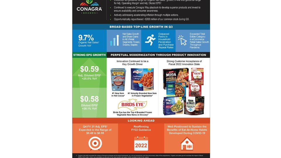 In the quarter, net income attributable to Conagra Brands increased 37.8% from $204.7 million in Q3 2020 to $281 million, translating in a gain from 42 cents per diluted share to 58 cents per diluted share.