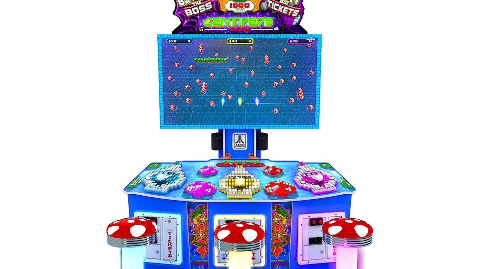 ICE again teamed up with Play Mechanix to bring a legendary game into the 21st Century. Centipede Chaos is a three-player attraction equipped with a 75-i HD monitor, three LED-illuminated stools that (of course) resemble fantasy mushrooms, and a distinctive attention-getting cabinet design.
