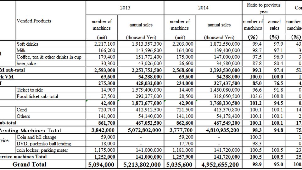 A study of Japan's vending performance reflects the nation's sluggish economic recovery. The Japanese Vending Machine Manufacturers Association's annual compilation reported that total vending sales fell 5% in 2014, inching down from 2013's ¥5.214 trillion ($42.9 billion at the current exchange rate) to ¥4.953 trillion ($40.7 billion) last year. Machines on location dipped 1.1% to 5,035,600 from 5,094,000 in 2013.