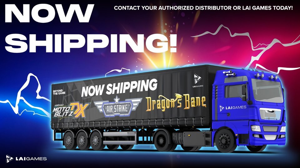 LAI Games has begun shipping motorcycle simulator Asphalt Moto Blitz, Dragon's Bane dual analog and video coin pusher, and Air Strike flying video game, according to a press release.