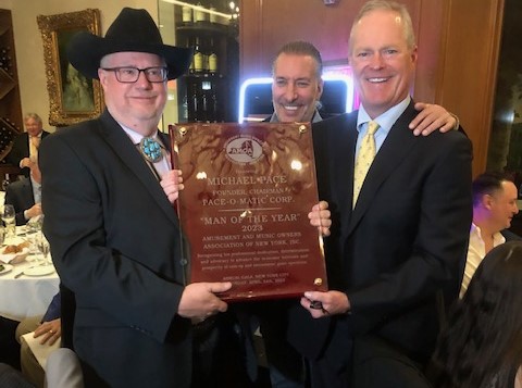 Michael Pace, founder and chairman of Pace-O-Matic Corp., received the 2023 guest of honor plaque at the Annual AMOA-NY gala. Making the award are AMOA-NY President Ken Goldberg, center, of Emerson Amusements, Woodside, New York and AMOA-NY Vice President Joe Bossolina, right, of McGee Amusements, Ridgefield, New Jersey. |