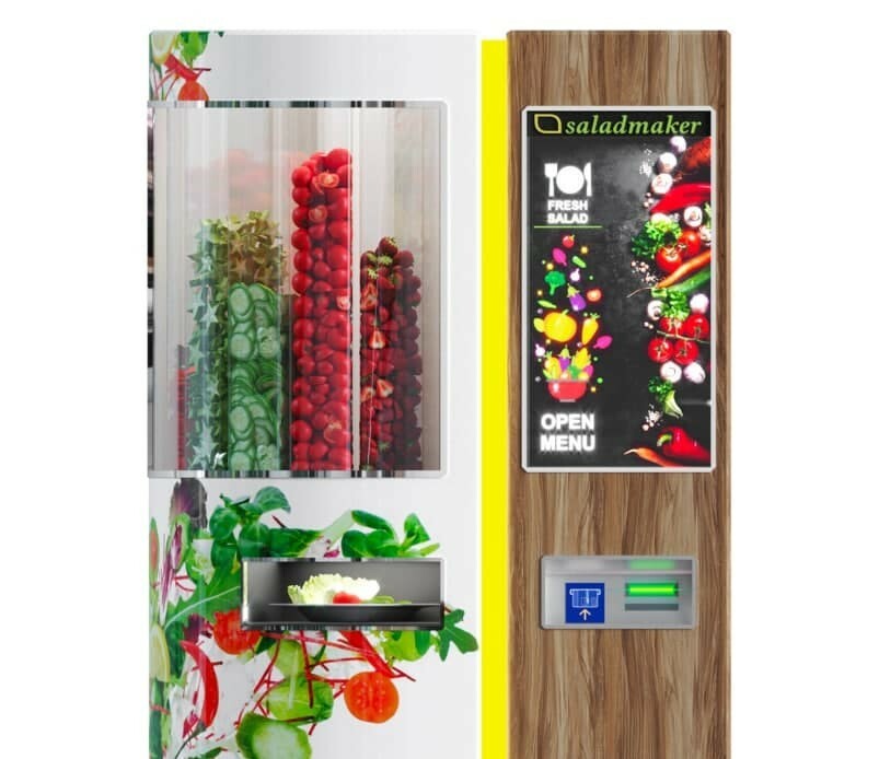 The Salatomat vending machine occupies two square meters and can be loaded with 16 basic ingredients — vegetables, cereals, potatoes, noodles and 20 dressings and toppings. The machine can cook up to 1,000 different dishes.