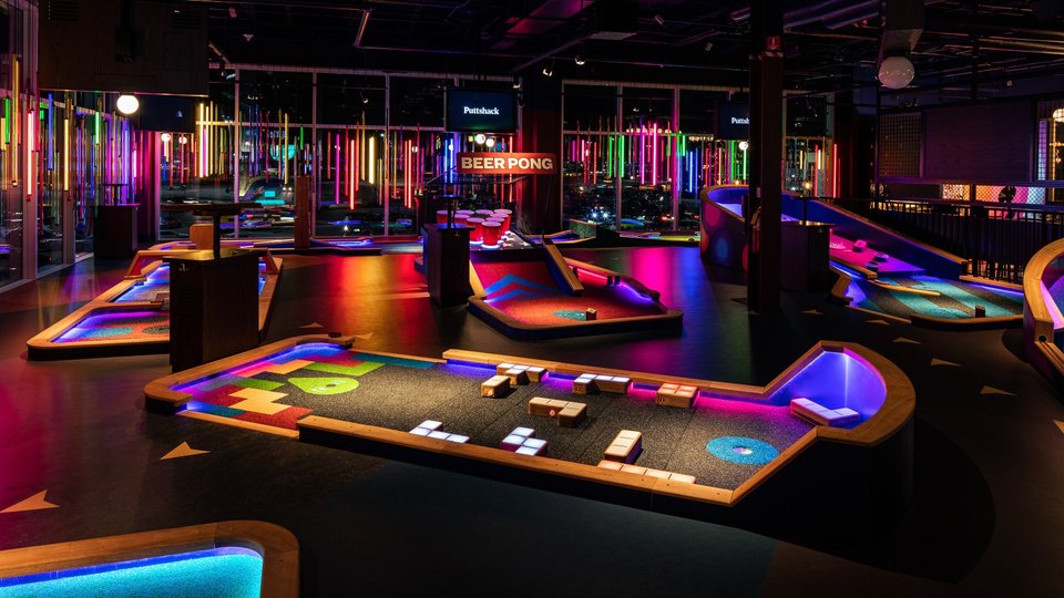 Puttshack Boston will expand across two floor levels covering more than 26,000 square feet. This new location will feature four nine-hole mini golf courses, accentuated by floor-to-ceiling windows with views of the waterfront and a nightclub featuring local DJs.