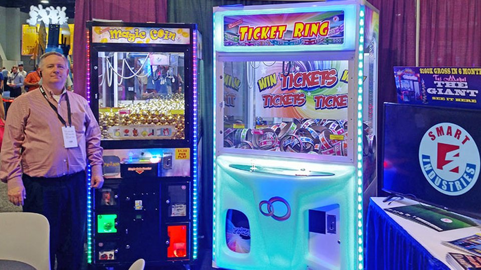 NOW SHIPPING: Jim Dupree of Smart Industries puts new Magic Coin and Ticket Ring cranes through their paces at this year's Bowl Expo in Las Vegas, NV.