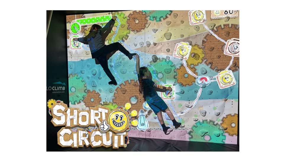 Short Circuit challenges up to four climbers to work together in an entirely new way to complete electrical circuits on a climbing wall using their bodies as conduits, accruing bonus points for teamwork.